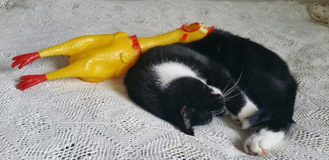 At least I got a rubber chick for my birthday. It wasn’t til the moment when I was standing there in the middle of the night with that thing in my hand, after I had recovered just a little from dizziness and nauseating contractions, and I heard the sound of that, to say the least ugly piece of rubber, that I realized that I had wished for this piece of crap, exactly this, for years. I’m sure I’ve wanted it for as long as I’ve been reading comics. That means as long as I’ve been able to read; 41 years. 5 years less than I’ve been loving cats. I have no idea why, but now you know: the cat was here before the chick.