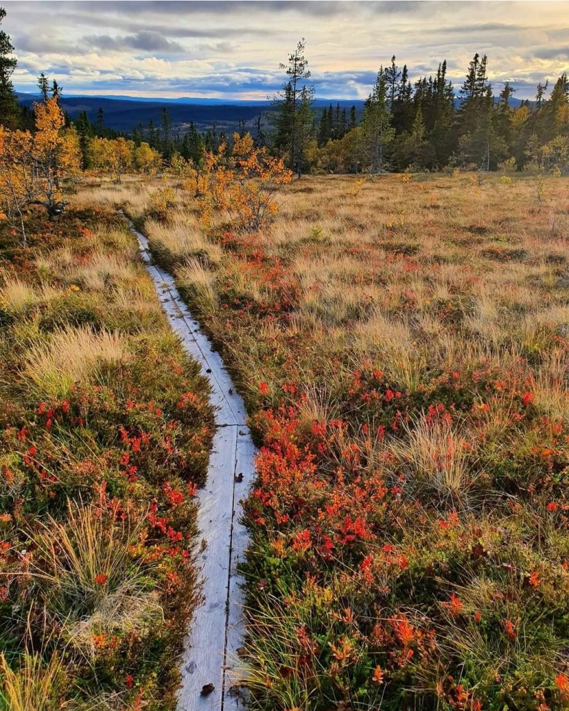 Et stykke nedenfor meg vokste myrgress i tuer som bøyde seg som blonde prinsesser i prosesjon til ære for høstværet og den kommende vinteren. De bar små kroner av ildrøde blader av blokkbær, og midt mellom dem gikk en sti av planker, slitt sølvgrå, lagt ned med mye møye og hardt arbeid av ivrige frivillige.