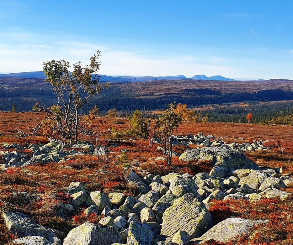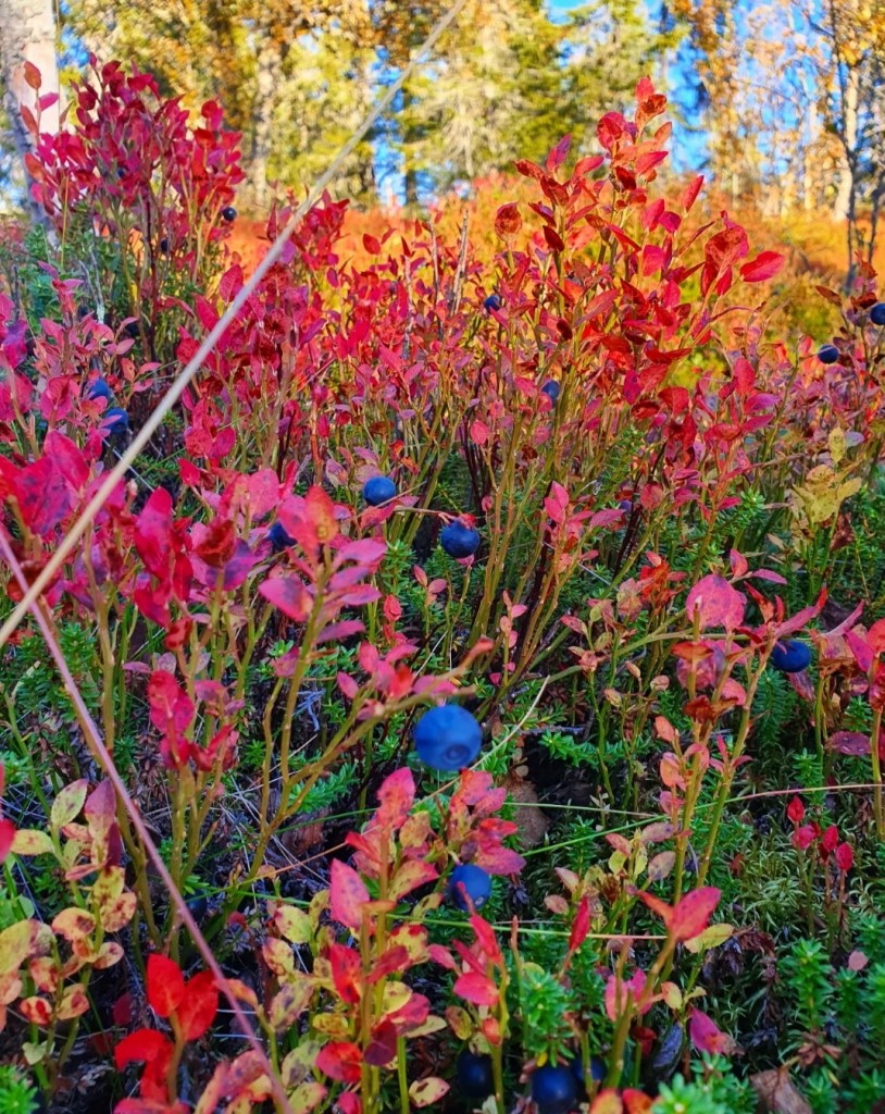 Blåbærlyngen rundt meg var gulgrønn, rød og endeløs, bare avbrutt av en og annen dott av hvit reinlav. Fjellbjørka sto spredt med hvite, tynne stammer og gult løv som skinte som soldråper i det skiftende lyset.